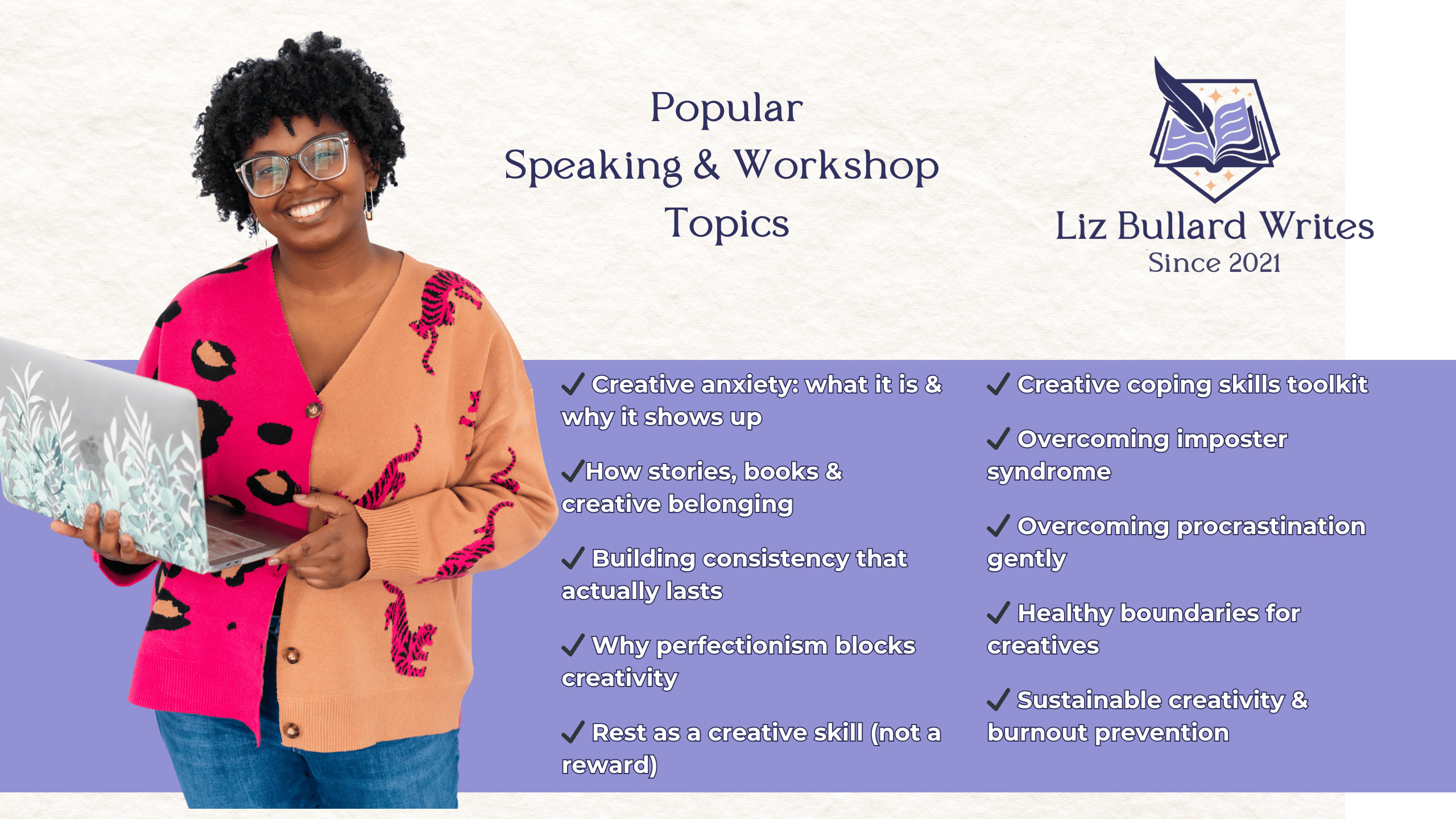 These workshops are designed for schools, libraries, book clubs, and creative communities who want more than inspiration alone. I blend creative wellness with practical, ready-to-use tools that continue supporting participants long after the session ends. Each workshop is interactive and thoughtfully paced, creating space to reflect, ask questions, and actively apply what’s being learned—so people leave with exactly what they need, not just notes to revisit later.